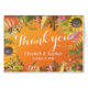 Hochzeitsdanken Sie Ihrer Card Vorlagen - elegante Herbst-Ahorn-Blätter, Pumpkins und Sonnenblumen Aquarellfarben-Blume auf Orange glänzenden Hintergrund. Alle Textstile, Farben, Größen können an Ihre Bedürfnisse angepasst werden.