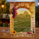 Eine künstlerisch bemalte Hochzeitseinladung mit einem Weingartenthema. Diese Einladung zeigt eine Landschaft im italienischen Stil mit einem römischen Bogen, Trauben, Wein und einer Sonnenblume. Sie können das Landschaftsbild durch ein benutzerdefiniertes Bild ersetzen, wenn Sie möchten. Es ist auch möglich, das Titelbild durch Ihren eigenen Text zu ersetzen. Alle Texte auf der Rückseite können individuell angepasst werden, inklusive der Veränderung von Schriftart, Schriftart und mehr. Für alle Anpassungsoptionen wählen Sie "Anpassen".