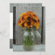 Eine Einladung zur Hochzeit im Herbst mit einem Foto aus einem Glas orangefarbener und gelber Blumen vor einem Hintergrund aus Barnholz. Suchen Sie nach passenden Artikeln in Jill's Paperie.