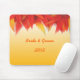 Hochzeit im Herbst Mauskissen mit Braut- und Bräutigamen und Jahr der Hochzeit. Entwickelt mit Blätter aus verfallenem rotem Ahorn.