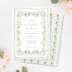 Elegante Hochzeitseinladung mit einer handgezeichnet Aquarellbild eines verzierten Vintagen Rahmens aus grünen und zarten Reben mit zauberhaften, gelben und blauen Singvögeln, die anmutig unter kleinen roten Blumen gekrönt sind und ein skurriles, aber raffiniertes Design schaffen. Die Namen der Braut und des Bräutigams sind in klassischer Weise in grüner Serifentypografie und die Details der Veranstaltung in einfacher Weise in grün Typografie dargestellt. Diese Einladung eignet sich perfekt für Paare, die die populäre, großtausendjährige Ästhetik annehmen und die Romantik vergangener Zeiten mit einer erfrischend modernen Touch verbinden.