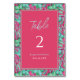 Hochzeit in tropischem Rosa und grüner Flora Tischnummer