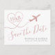 Rose Gold Blush Pink Hochzeit in Urlaubsort Save the Date Postcard mit einem lustigen Flugzeug Herz-Monogramm, plus elegante minimale moderne Typografie. Klicken Sie auf "Weitere Einstellungen vornehmen", um zusätzliche Bearbeitungsfunktionen wie Textfarbe, Schriftart und Layout zu erhalten. Ideal für tropische, Strand-, Insel-, Stadt-, Berg- und Abenteuerorte Hochzeit in Urlaubsort, zu denen Ihre Gäste reisen. Karo in unserem Designer-Shop für unzählige koordinierende Artikel!