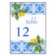 Blau-mediterrane Kacheln und Zitronen Hochzeitsfeier Tischnummer.