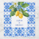 Blau-mediterrane Kacheln und Zitronen Hochzeitsweinetiketten.