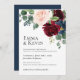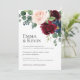 Ein wunderschönes Aquarellbouquet aus Rose in Bordeaux, Rosa und Marineblau mit Eukalyptus und Grünpflanzen Akzent dieser geschmackvollen Hochzeitseinladung. Das Farbschema ist eine beliebte Wahl, die für Herbst- und Winterhochzeiten schön ist, aber auch für Frühjahr- und Sommerhochzeiten genutzt werden kann. Die Textvorlage verwendet eine Kombination aus elegantem Serifentyp, gepaart mit einer begleitenden Schrift, die ein fertiges Aussehen verleiht. Die Rückseite der Einladung ist eine solide Marine blau. Personalisieren Sie die Textvorlage mit Ihren Trauminformationen.