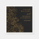 Diese elegante Hochzeitsserviette besticht durch ein zartes Blumendesign mit Blume, Vögeln und Blätter auf goldfarbenem und schwarzem Hintergrund. Der Text kombiniert handgeschriebene Skript- und Serif-Schriftart für ein stilvolles und modernes Aussehen. Ideal für eine Hochzeit im Herbst im Winter oder Herbst.