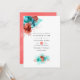 Türkisfarbene und lebendige Korallen Rose und tropisches Glitzer Blattwerk Sommerhochzeit Einladungen, die schnell und einfach auf Ihre Event-Besonderheiten angepasst werden.