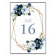 moderne geometrische Tischnummer und hellblaue Blumenhochzeit.