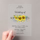 Diese exquisite Acrylhochzeit-Einladung zeichnet sich durch ein reizvolles und künstlerisches Design aus und zeigt wunderschöne Aquarellbilder von fröhlichen gelben Sonnenblumen und zauberhaften blauen Wildblumen. Die Gesamtästhetik wird durch eine Kombination aus niedlicher und eleganter Typografie ergänzt, die sorgfältig ausgewählt ist, um die Blumenbilder zu ergänzen. Das Design erinnert an einen ausgesprochen rustikalen Stil, der ein warmes und einladendes Ambiente schafft. Das klare Acrylmaterial erlaubt es den zarten Aquarellblumen und blauen Wildblumen, wahrhaft zu leuchten und schafft so einen unvergesslichen ersten Eindruck für Ihren besonderen Tag. Die niedliche und dennoch elegante Typografie harmoniert perfekt mit dem rustikalen Stil und bietet eine raffinierte und dennoch zugängliche Einladung. Dieses Sonnenblumen- und Wildblume-Design ist perfekt für eine rustikale Hochzeit. Das Acrylmaterial bietet eine moderne Drehung auf klassischem Design.