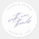 Eleganter handgeschriebener Text "mit unserem Dank" in einem einfachen, aber auffälligen Gunst-Aufkleber hier gezeigt, der auch Ihre Namen und Hochzeitstag in periwinkle auf weiß. Suchen Sie nach ID954, um weitere Produkte und Farbwahl für diese Hochzeitssuite zu sehen.