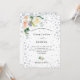 Eine glamouröse Einladung zur Hochzeit. Ein schick weißer Hintergrund. Die Blume sind in Weiß- und Rose-Gold mit Grünpflanzen gestaltet und mit Imitaten, Diamanten und Aquarellen geschmückt. Personalisieren und fügen Sie Ihre Namen und Hochzeitsdetails. Schwarzer Text. Zurück: weißer Hintergrund und Diamanten.