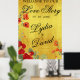 Einfaches modernes Design mit einem prächtigen orangefarbenen und roten Blumendesign auf goldfarbenem Hintergrund. Alle Informationen können leicht geändert werden, um Ihre eigene Hochzeitsempfehlung zu geben. Teil einer Hochzeitssuite von Chessie's Fine Designs.