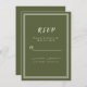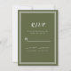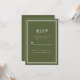 Die einfache und elegante, klassische RSVP-Kapselkarte für Hochzeiten zeichnet sich durch ein minimalistisches Design aus, das mit einem doppelten Rahmen in knalligem Weiß auf einem angesagten, olivgrünen Hintergrund gestaltet ist. Personalisieren Sie mit dem Datum Ihrer Hochzeit. Stellen zur Verfügung, an denen Ihr Gast Namen und Antworten für eine Rückantwort hinzufügen kann. Schrift und Schrift sind in knalligem Weiß gehalten. Die Rückseite der Karte ist grün.