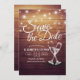 Save the Date Einladungskarten-Vorlagen Hochzeit - Elegantes Schriftzeichen, Vintage Champagnerbrille und Streichellichter auf rustikalem Holzhintergrund. Ein perfektes Design für Ihren großen Tag! Alle Textstile, Farben, Größen können an Ihre Bedürfnisse angepasst werden.