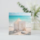 Eine leere Karte und eine Erholung auf einem Sandstrand, umgeben von Muscheln, Seestern und türkisfarbenem Meereshintergrund. Alle Texte können geändert werden.