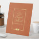 Schaffen Sie ein elegantes Podestschild für Hochzeiten. Hochzeitstabletop für Paare, die Terrakotta-Party suchen und Terrakotta als Hochzeitsfarbe verwenden. Passen Sie den Text auf der Vorderseite an. Terrakotta und Goldfarben. Verwenden Sie die Vorlage, um Ihr eigenes Hochzeitszeichen zu erstellen.