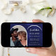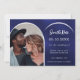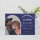 Ein Foto Save the Date Karte für Ihre Hochzeit On front: Fügen Sie Ihre eigene vertikale Größe Foto. Imitate goldenes Foto Bogen Rahmen. Ein marineblauer blauer Hintergrund, weißer Text. Die blaue Farbe ist ungleichmäßig. Personalisieren Sie Ihre Namen und das Datum und fügen Sie sie hinzu.