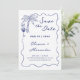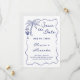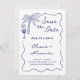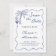 Die guten Neuigkeiten Ihrer nächsten Nuptials mit dieser charmanten und lässigen Küstentheorie speichern Sie das Datum, das handgezeichnete Doodles und ein individuelles Paar Wappen auf der Rückseite. Zu den Illustrationen zählen eine tropische Palme, Cocktails und Seesterne-Muschel in einem whimsical Squiggle-Wellenrand. Die blaue Darstellung der nautischen Marine auf weißem Hintergrund ist perfekt für informelle Feste am Meer.