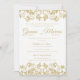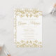 Hübsche Hochzeitseinladung in Gold und Weiß, oben und unten mit goldfarbenem Damast-Muster verziert für extra Bling. Klassischer, formaler Text und eigene Kunstwerke für ein einzigartiges und wunderschönes Set für Hochzeitsfeiern.