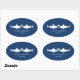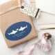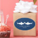 Gastgeschenk Hochzeit-Aufkleber in klassisch marineblau mit weißer Hai-Silhouette mit Herz, Pärchennamen und Datum.