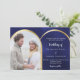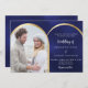 Ein marineblau Hintergrund, Foto Imitats goldenen Bogen Hochzeit Einladung. Der blaue Hintergrund ist ungleichmäßig. Auf der Vorderseite: Fügen Sie Ihr eigenes Foto in vertikaler Größe hinzu. Personalisieren Sie Ihre Namen und Details und fügen Sie diese hinzu. Zurück: Sie können mehr Text hinzufügen, wenn Sie gewollt haben. Gehen Sie in das Entwurfstool und fügen Sie die hintere Ebene hinzu.
