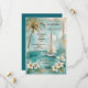 Diese Hochzeitseinladung bietet ein ruhiges Wassersportzentrum mit einer Yacht, die auf einem ruhigen türkisblauen Wasser segelt. Der Hintergrund zeigt einen sanften Aquarelleffekt in Blau- und Grüntönen und schafft ein beruhigendes ozeanisches Ambiente. Eine anmutige Palme und eine lebendige weiße Lilie bilden den Rahmen der Szene, die tropischen Charme und Eleganz verleiht. Das Design ist von einem subtilen vergoldeten Rahmen umgeben, der seine Raffinesse erhöht. Ideal für eine romantische und abenteuerliche Hochzeit am Meer. Personalisieren Sie den Text bezüglich der Namen und Details der Hochzeit. Sie können die Karte auf Ihr mobiles Gerät oder Ihren Computer herunterladen. Ich entwarf die Karte mit ai-Technologie.
