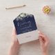Das Ganze in einer marineblauen Hochzeitseinladung mit hübschen Saitenlichtern, Blumengrün und eleganter Typografie. Die Einladung enthält eine perforierte RSVP-Karte, die für Sie individuell adressiert oder links als leere Karte für die Handschrift der Adressdaten Ihres Gastes verwendet werden kann. Entwickelt von Thisisnotme©