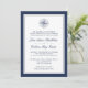 Elegant marineblau grenzt an nautische Hochzeitseinladungen mit einer Kompass-Illustration an der Spitze mit Ihren Hochzeitsdetails in klassischem Drehbuch und Serifenschrift. Die Karten werden in schmale Marinefelder und weiße Küstenstreifen umgewandelt.