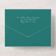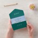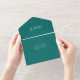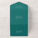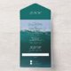 All-in-One Hochzeitseinladung mit großen Ozeanwellen, in Tiefsee grüne Farbe. Für Paare, die auf oder in der Nähe des Ozeans heiraten wollen. Die einteilige Einladung und Antwortkarte öffnet sich mit Text in der Klappe, in der Mitte und unten, wo sich die RSVP-Karte löst. Ein Hochzeitsmonogramm kann oben unter der Klappe hinzugefügt werden. Sie können die Antwortkarte ganz einfach wie eine Postkarte ausfüllen und in die E-Mail ablegen - sie wird als Postkarte verschickt. Die Außenfarbe dieser Karte ist dunkelgrün. Weiße Textbereiche werden für Adressen bereitgestellt - Rücksendeadresse, Postanschrift und UAWG return-to-address. Alle Texte können bei Bedarf einfach geändert oder gelöscht werden.