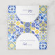 Dieses rustikale Design zeichnet sich durch ein Hintergrundmuster von blauen, gelben und weißen Aquarellen portugiesischen Fliesen oder Azulejos. Die Bereiche für Tischnummern und die Namen der Gäste werden durch blaue Linien auf weißem, bogenförmigen Hintergrund mit dem Wort "Tabelle" in blauem Kalligrafieschrift dargestellt. Die Innenseite der Karten ist blau.