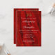 Eine raffinierte, luxuriöse rote Hochzeitseinladung mit einem Muster roter Seide. An der Kante befindet sich ein dünner, zweifüßiger Goldrahmen, an der Spitze zwei goldene Hochzeitsbands. Auf der anderen Seite befinden sich die Namen der Braut und des Bräutigams sowie das Datum der Hochzeit, darunter eine kleinere Version der goldenen Hochzeitsringe.