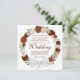 Diese wunderschönen Hochzeitseinladungen verfügen über einen rustikalen, aber wunderschönen handbemalten Wasserfarbenkreuzer mit Rost-Orange- und Korallenpfirsichbäumen, Blume, Blättern und Gartenpflanzen mit weißem Satin-Bogen am Boden. Das Design ist einfach und elegant mit extravaganten Schriftzeichen auf weißem Hintergrund. Auf der Rückseite befindet sich ein eleganter Blumenstrauß auf einem bernsteinfarbenen Hintergrund. Ideal für Herbst- oder Herbstfeiern.