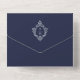 Eine Vintage, elegante und ungewöhnliche Hochzeitseinladung aus Marine und Silber mit einem Monogramm in einem Vintagen Imitat silbernes Wappen auf beiden Seiten der Falte und einem abnehmbaren UAWG mit Imitaten silberne Folienquadrate. Wenn gefaltet, sieht es wie ein Umschlag aus, mit dem Hochzeitsmonogramm im Wappen auf der Falte gedruckt und per Post verschickt werden kann. Die abnehmbare UAWG hat auf der Rückseite die Adresse gedruckt und auch einen Platz für die Briefmarke, sodass sie als Postkarte per Post verschickt werden kann. Der Text ist hellgrau. Der Hintergrund ist marineblau.
