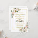 Elegantes Gold Script, Watercolor Pink Roses und White Magnolias Wedding Einladung beinhaltet botanische Vegetation und Eukalyptus Blätter auf einem goldenen Rahmen. Foto zurück.