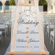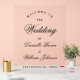 Ein einfaches, aber elegantes, transparentes Begrüßungszeichen. Das Wort Hochzeit und die Namen der Braut und des Bräutigams sind in einer eleganten Kalligraphie geschrieben, die Erholung in Kappen. Der gesamte Text ist schwarz. Die Begrüßungsworte werden vor allem in der Erholung gewölbt.