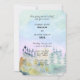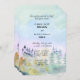 Ein wunderschönes Hochzeitseinladungs-Set im Hintergrund von Grüntönen und Blues mit Bäumen im Vordergrund. Diese Einladung ist Teil einer Produktreihe, die dem Design entspricht. Dies ist eine lässige Einladung für einen Seebadeort-Service und Empfang