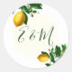 Lemon Botanical Greenery Monogram Modern Wedding Monogram Aufkleber Design mit Ihren Informationen leicht zu ändern, um Ihre Hochzeit stationär anpassen. Ein weißer Hintergrund mit den Initialen Bride und Grooms. Persönliche Hochzeit stationär von Just Fine Designs.