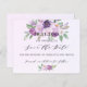 Ein modernes und elegantes Save the Date für eine Hochzeit. Wasserfarbene violette Farbe, lavender Hintergrund, schwarzer Text. Mit violetten und violetten Blumen dekoriert. Personalisieren und fügen Sie ein Datum und Namen hinzu. Der Text: Save the Date ist mit einem großen angesagten, handgeschriebenen Stilskript geschrieben. 1 Blatt = 1 Save the Date bedruckte Kante bis Kante.