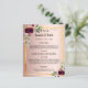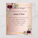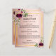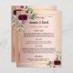 Ein elegantes bohemianisches Hochzeitsmenü und ein Abend-Programm. Federn und üppige, wasserfarbene Rose in Bordeaux. Vorlagen für Ihre Namen, Datum, Hochzeitsmenü und Programm. Ein Imitat goldener Rahmen und eine schicke Rose goldenen Farbverlauf Hintergrund.