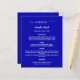Ein klassisches Hochzeitsmenü. Ein königlich blauer Hintergrund. Weißer Text. Personalisieren Sie Ihren Namen, das Datum und das Menü und fügen Sie es hinzu. Sie können mehr Text hinzufügen, Fotos auf der Rückseite. 1 Blatt = 1 Menü, mit dem die Kante an Kante aufgedruckt ist.