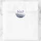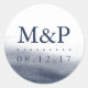 Siegel Sie Ihre Einladungen, Favoriten und mehr mit unseren schicken mit Monogramm Aufklebern an der Küste. Das runde Design mit seinen Initialen und dem Hochzeitstag in eleganter, blau-marineblauer Schrift mit einem schieren marineblau-blauen Aquarellhintergrund, der den Eben und Fluss des Ozeans anregt. Koordiniert mit unserer Hochzeitskollektion für Navy Tides.
