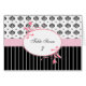 Eine trendy Tischnummerkarte für einen Hochzeits-Empfang mit einem Chicschwarzweiss-Damastmuster auf den Spitzen- und sassy Pinstripes auf der Unterseite, geteilt durch einen girly rosa Blumenrahmen. Personifizieren Sie, indem Sie die Tischnummer addieren.