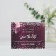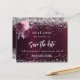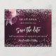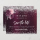 Ein modernes und elegantes Save the Date für eine Hochzeit. Ein tiefburgundischer Hintergrund mit Blume und Imitaten verziert silberne Konfetti. Personalisieren und fügen Sie ein Datum und Namen hinzu. Der Text: Save the Date ist mit einem großen angesagten, handgeschriebenen Stilskript geschrieben. 1 Blatt = 1 Einladung mit Druckkante bis Kante.