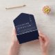 Diese minimalistische Hochzeitseinladung besticht durch moderne Typografie auf marineblau-blauem Hintergrund. Die Einladung enthält eine perforierte RSVP-Karte mit Ihrem Hochzeitswebsite QR Code. Entwickelt von Thisisnotme©