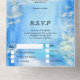 Ein wunderschönes tropisches Inseldesign mit offenem Fenster und Blick auf die kristallklaren, blauen Ozeanwellen und das türkisfarbene Wasser. Eine Single-Yacht kann in der Entfernung unter flauschigen weißen Wolken signiert werden. Unter der Fensterscheibe befindet sich ein blau-weißer Meeresgrund mit hübschem, weißem Seestern und zarten Blasen. Das untere Drittel verfügt über eine Antwortkarte mit personalisierter uAwg-Adresse und Menüoptionen, die Ihre Gäste abschließen können. Diese sind ideal für Hochzeitsfeiern zum Thema Strand. Partys zum Jubiläum an der Küste und Veranstaltungen zum Thema Meer.