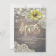 Hochzeitsplanung / Unterkunft und Informationskarte / Gästebuchskarte / Details zur Hochzeit. Vintage Spitzen, Sonnenblumen und Streichelleuchten auf rustikalem Holzhintergrund. Alle Textstile, Farben, Größen können an Ihre Bedürfnisse angepasst werden!