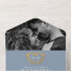 Dusty blau und goldfarben auf weißem grafischem Gold Effekt Herz mit Monogramm Hochzeit All-in-One Einladung mit QR Code Antwort Option. Personalisieren Sie diese abnehmbare Antwort Hochzeitseinladung mit Ihren eigenen Einzelheiten der Hochzeitsfeier, fügen Sie Ihre Essensoptionen zu Ihren abnehmbaren Antworten hinzu und fügen Sie Ihren eigenen QR-Code in Farbe #879baf ein, wenn Sie Hilfe bei der Codegenerierung und Designänderungen benötigen, kontaktieren Sie mich bitte. Andere Farben und passende Hochzeitsartikel sind erhältlich. © Original Herzkunst und Design von Sarah Trett für www.mylittleedenweddings.com auf Zazzle.