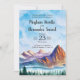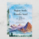 Gebirge mit Wasser und Pinien in Aquarell auf dem Boden der Einladung und ein schöner blauer Himmel. Sie können alle Textdetails bearbeiten. Die Rückseite der Karte hat einen nahen Teil des Kiefernwaldes.