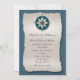 Elegante Hochzeitseinladungen im Vintagen Stil mit blauem Kompass und gerissener Beige-Papier-Illustration über Blau.